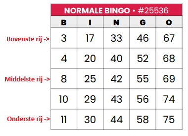 Hoewel het op het eerste gezicht kan lijken alsof de getallen op je bingokaart willekeurig staan afgedrukt, is er een duidelijke logica in de manier waarop de cijfers staan ingedeeld. Omdat er in totaal 75 getallen worden gebruikt in de bingo en er vijf kolommen (verticale rijen) op een bingokaart staan, zijn de getallen op de kaart in vijf delen afgedrukt. Bovenaan de kaart staan bovendien de letters B I N G O afgedrukt, waarbij iedere letter boven een bepaalde kolom staat.